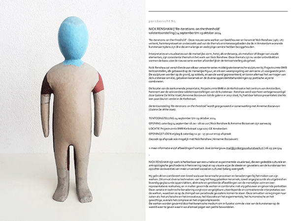 This new series of works by sculptor and ceramist Nick Renshaw revisits, reimagines and reinvestigates many of the themes and areas of interest which have been of concern to the artist during his three decades long multifarious career as visual artist. His interpretations and visualisations of the human form either as subject, as metaphor, or carrier of visual motifs have been consistent themes throughout the artist’s career, and these interests are further advanced to form the foundation of both this new series of works individually as well as in this exhibitions as a whole. Renshaw will exhibit several related series of ceramic sculptures, each based on the human figure, and each echoing a series created at different moments in previous years. The sculptures are presented both at ground level, on platforms, as well as on the wall, and they will all demonstrate the artist’s capacity to combine clay, fired ceramic, and their surface treatments in a poetic manner. The location of this presentation in the exhibition space of Projectruimte BMB in the centre of Amsterdam, echoes many of the artist’s past solo exhibitions. Renshaw was formerly represented by Galerie De Witte Voet before that gallery’s closure in 2017.
