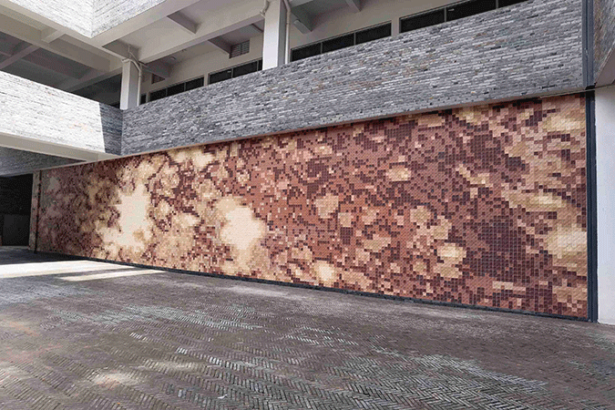 Landscape is a large ceramic tile mural cladding a thirty metre long by four metre fifty centimetre high exterior wall of a recently finished head office and factory building in the city of Dehua, Fujian Province in the south of China. The mural is realised using twenty three thousand individuallyl handmade and hued tiles which combine together to create both a practical exterior for this part of the building as well as a landscape image, the form of which appears somewhat undefined when observed from close by but when viewed from distance becomes clearly visible. The wall for which the mural was created was designed by the architect specifically to carry some form of adornment; adornment which I deemed should complement the building and its surroundings as well as enrich the lives and experience of the people working here. The wall in question forms part of an open courtyard and runs adjacent to an exterior walkway leading from the main entrance of the building to its central section. The wall acts then both to signify the importance of this location as well as an invitation to enter the building. The form of the tiles was designed specifically for this project, each having a unique three dimensional relief to further enhance the overall design.
