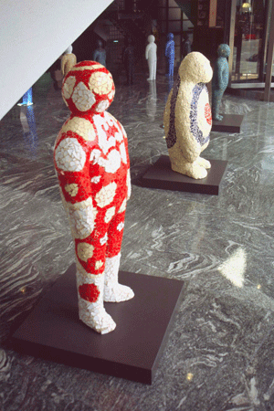 This exhibition was a presentation of sculptures made during previous years which had been taken up by a variety of corporate and museum collections, as well as those of several private individuals. In addition to this overview of existing works a series of new pieces from the Skinmen series were especially made for the occasion. The umbrella series of exhibitions entitled Maliebeeld in which my own solo show formed a part was conceived to celebrate those contemporary artists whose work is both sculptural, generally monumental in scale, and whose practice had been based largely within the visual arts context of the Netherlands. The theme of this and other exhibitions in the series being that of a presention of works held in a range of institutional collections of Dutch visual art linked directly to the location in which Maliebeeld was housed. The large open spaces of the Malietoren being home to the leading body representing Dutch corporations. Amongst the works either lent or made for the exhibition were those from the series Plaything (1996), Earthling Candyman (2001), Native Earthling (2004), and Skinmen (1997-2005).
