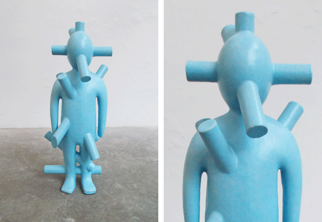 The exhibition Other Origins takes it’s name from the series of ceramic sculptures developed for this presentation. These figures are created from the same fundamental underlying mold-manufactured figure. This figure symbolises the human form as is understood across culture and time and is perceived both in terms of early or primeval depictions as well as those of a contemporary nature which incorporate a comparable stylised representation of anatomy. Onto this idealised human motif the singular character of each sculpture is described using a combination of clay material, colour palette, texture, glaze, and contrasting inanimate additions. The subsequent composition of each figure expresses a variety of characteristics, including predominantly the juxtaposition of apparently contradictory elements. This body of work should be understood as an exploration of comparability, uniqueness, similarity, and identity. The method of creation itself, contrasting sculpture and mold-manufacturing emphasising further these metaphorical references.