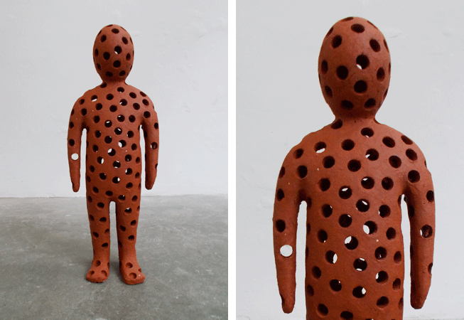 The exhibition Other Origins takes it’s name from the series of ceramic sculptures developed for this presentation. These figures are created from the same fundamental underlying mold-manufactured figure. This figure symbolises the human form as is understood across culture and time and is perceived both in terms of early or primeval depictions as well as those of a contemporary nature which incorporate a comparable stylised representation of anatomy. Onto this idealised human motif the singular character of each sculpture is described using a combination of clay material, colour palette, texture, glaze, and contrasting inanimate additions. The subsequent composition of each figure expresses a variety of characteristics, including predominantly the juxtaposition of apparently contradictory elements. This body of work should be understood as an exploration of comparability, uniqueness, similarity, and identity. The method of creation itself, contrasting sculpture and mold-manufacturing emphasising further these metaphorical references.