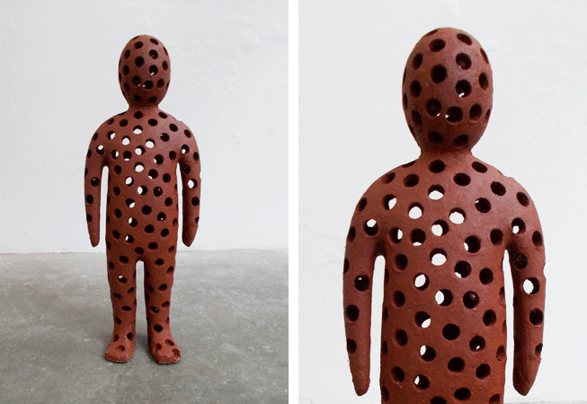 The exhibition Other Origins takes it’s name from the series of ceramic sculptures developed for this presentation. These figures are created from the same fundamental underlying mold-manufactured figure. This figure symbolises the human form as is understood across culture and time and is perceived both in terms of early or primeval depictions as well as those of a contemporary nature which incorporate a comparable stylised representation of anatomy. Onto this idealised human motif the singular character of each sculpture is described using a combination of clay material, colour palette, texture, glaze, and contrasting inanimate additions. The subsequent composition of each figure expresses a variety of characteristics, including predominantly the juxtaposition of apparently contradictory elements. This body of work should be understood as an exploration of comparability, uniqueness, similarity, and identity. The method of creation itself, contrasting sculpture and mold-manufacturing emphasising further these metaphorical references.
