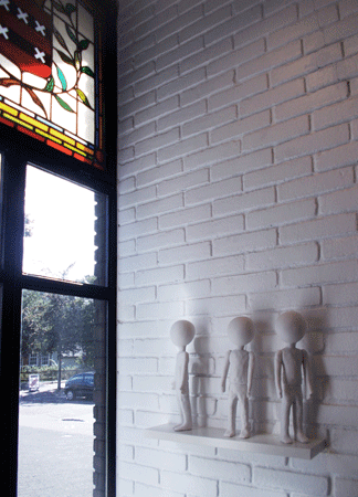 Staand (Standing) is the second part of commissioned work for the local authority of Ouder-Amstel. It augments the recent redevelopment and expansion of their existing town hall and it's surrounding urban spaces in Ouderkerk aan de Amstel, near to Amsterdam. This series of two hundred thirty centimetre high figurative sculptures are installed throughout the interior spaces of both existing and new portions of the town hall. Similarly to the monumental work Zittend (Sitting) outside, they were commissioned to both strengthen the breadth and quality of art in the public spaces under the authority's jurisdiction as well as enrich the architecture of the new building. These porcelain works are positioned intramurally, in hallways, meeting rooms, member offices, council chambers, and marriage rooms, and act to reinforce the relationship between the original and contemporary architecture of the building. These works also symbolise the inhabitants of the community outside the building, suggesting the constant presence of this population while the act of governance in all it's forms and at all stages takes place on their behalf.