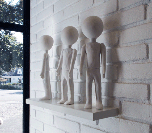 Staand (Standing) is the second part of commissioned work for the local authority of Ouder-Amstel. It augments the recent redevelopment and expansion of their existing town hall and it's surrounding urban spaces in Ouderkerk aan de Amstel, near to Amsterdam. This series of two hundred thirty centimetre high figurative sculptures are installed throughout the interior spaces of both existing and new portions of the town hall. Similarly to the monumental work Zittend (Sitting) outside, they were commissioned to both strengthen the breadth and quality of art in the public spaces under the authority's jurisdiction as well as enrich the architecture of the new building. These porcelain works are positioned intramurally, in hallways, meeting rooms, member offices, council chambers, and marriage rooms, and act to reinforce the relationship between the original and contemporary architecture of the building. These works also symbolise the inhabitants of the community outside the building, suggesting the constant presence of this population while the act of governance in all it's forms and at all stages takes place on their behalf.