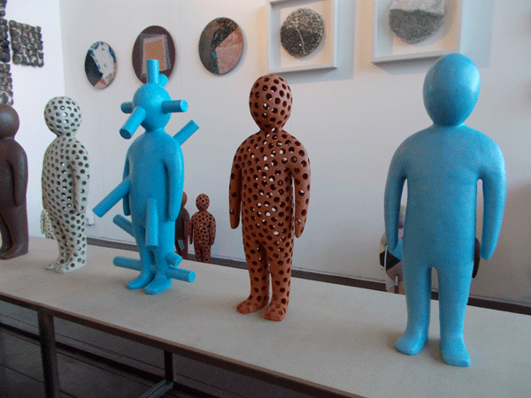 The exhibition Other Origins takes it’s name from the series of ceramic sculptures developed for this presentation. These figures are created from the same fundamental underlying mold-manufactured figure. This figure symbolises the human form as is understood across culture and time and is perceived both in terms of early or primeval depictions as well as those of a contemporary nature which incorporating a comparable stylised representation of anatomy. Onto this idealised human motif the singular character of each sculpture is described using a combination of clay material, colour palette, texture, glaze, and contrasting inanimate additions. The subsequent composition of each figure expresses a variety of characteristics, including predominantly the juxtaposition of apparently contradictory elements. This body of work should be understood as an exploration of comparability, uniqueness, similarity, and identity. The method of creation itself, contrasting sculpture and mold-manufacturing emphasising further these metaphorical references.