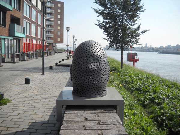 The exhibition Riverside formed part of the umbrella project Het Drie Rivierenpunt (The Three Rivers Project). This project is aimed at the creation of a sculpture avenue along the dam promenade of the Merwehoofd in the town of Papendrecht. The sculptures are located on the cusp of the beautiful open landscape of the river and that of the adjacent urban spaces. It is an area of unique spacial quality where the gently turning river and adjacent dams open into the enormity of the panorama at the heart of the Drechtsteden (Drecht Cities). For this long running exhibition the works Kupfernickel (2007) and Casement Head (2003) were installed. They were chosen both for their direct connection to the figurative theme of the exhibition, as well as for their particular suitability to such a monumental geographical landscape. The project is organised by the Stichting Beeldenpark Drechtoevers.