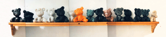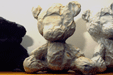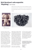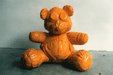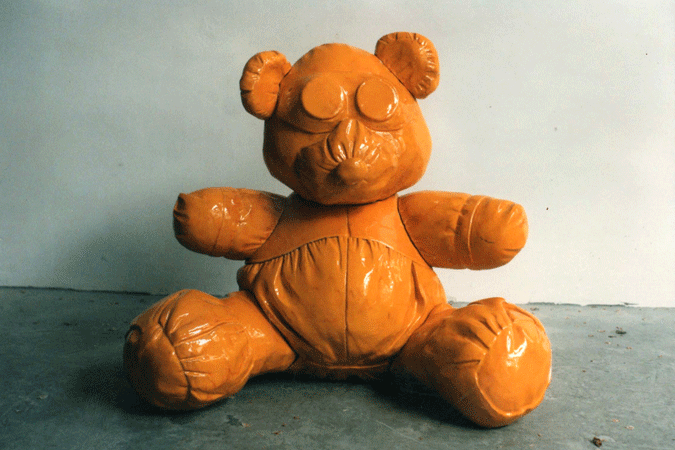 Plaything is the title of an exhibition of ceramic sculptures which portrayed a series of outsized toys or other objects which are in some way suggestive of such ideas. What are recognisable as supposedly unthreatening images associated with notions of comfort and solace are made in such ways using a medium which by and large contradicts such qualities. That is, the fired ceramic state becomes hard, frozen and unmoving. The surfaces, though seemingly as soft and giving as the originals they represent are cold and unyielding. The choice of glaze material above the stone-like mass beneath challenges similarly the idea of a soft material. Shiny, smooth, literally glass like surfaces encase the form making it inpenetrable. The industrial yellows and blues accentuate the incongruity of the sculptures challenging the concept of the warm fabric one would expect. The works are at once a contemporary visual interpretation, calling into question preconceived expectations, as well perhaps as preserved archeological finds, encased in their protective shells.