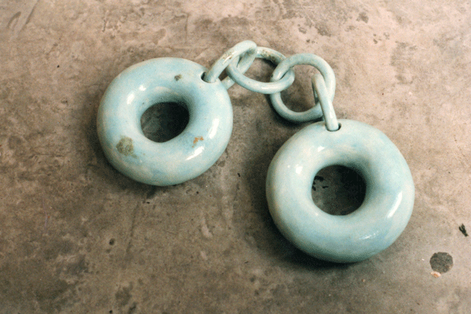 Plaything is the title of an exhibition of ceramic sculptures which portrayed a series of outsized toys or other objects which are in some way suggestive of such ideas. What are recognisable as supposedly unthreatening images associated with notions of comfort and solace are made in such ways using a medium which by and large contradicts such qualities. That is, the fired ceramic state becomes hard, frozen and unmoving. The surfaces, though seemingly as soft and giving as the originals they represent are cold and unyielding. The choice of glaze material above the stone-like mass beneath challenges similarly the idea of a soft material. Shiny, smooth, literally glass like surfaces encase the form making it inpenetrable. The industrial yellows and blues accentuate the incongruity of the sculptures challenging the concept of the warm fabric one would expect. The works are at once a contemporary visual interpretation, calling into question preconceived expectations, as well perhaps as preserved archeological finds, encased in their protective shells.