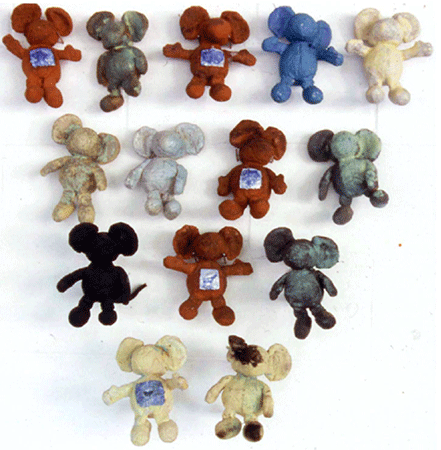 Plaything is the title of an exhibition of ceramic sculptures which portrayed a series of outsized toys or other objects which are in some way suggestive of such ideas. What are recognisable as supposedly unthreatening images associated with notions of comfort and solace are made in such ways using a medium which by and large contradicts such qualities. That is, the fired ceramic state becomes hard, frozen and unmoving. The surfaces, though seemingly as soft and giving as the originals they represent are cold and unyielding. The choice of glaze material above the stone-like mass beneath challenges similarly the idea of a soft material. Shiny, smooth, literally glass like surfaces encase the form making it inpenetrable. The industrial yellows and blues accentuate the incongruity of the sculptures challenging the concept of the warm fabric one would expect. The works are at once a contemporary visual interpretation, calling into question preconceived expectations, as well perhaps as preserved archeological finds, encased in their protective shells.