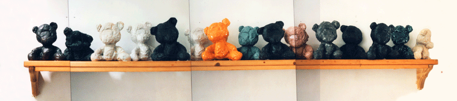 Plaything is the title of an exhibition of ceramic sculptures which portrayed a series of outsized toys or other objects which are in some way suggestive of such ideas. What are recognisable as supposedly unthreatening images associated with notions of comfort and solace are made in such ways using a medium which by and large contradicts such qualities. That is, the fired ceramic state becomes hard, frozen and unmoving. The surfaces, though seemingly as soft and giving as the originals they represent are cold and unyielding. The choice of glaze material above the stone-like mass beneath challenges similarly the idea of a soft material. Shiny, smooth, literally glass like surfaces encase the form making it inpenetrable. The industrial yellows and blues accentuate the incongruity of the sculptures challenging the concept of the warm fabric one would expect. The works are at once a contemporary visual interpretation, calling into question preconceived expectations, as well perhaps as preserved archeological finds, encased in their protective shells.