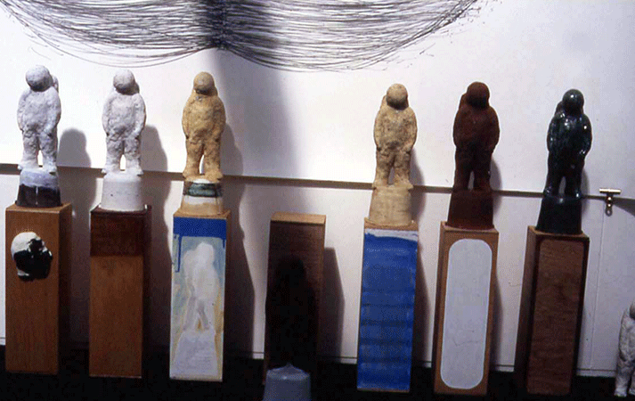 Range was both title and central theme of an exhibition which employed a variety of experimental processes using ceramic in it's broadest sense to portray the figure. What can be viewed as more accepted material qualities of the medium itself were utilised and often combined with a frequently exploratory approach to it's handling. Testing as it were the range of possiblities with which clay in it's raw or unfired state, as well as ceramic in it's fixed condition could be exercised to suggest both new interpretations of the human form as well as alternative ways of using this material. The figure acts in these works as a ground as it were onto which experiments are drawn, coupled, bound, adhered, wrapped, or fused. The process presents a visual expression which communicates a somewhat incongruous almalgamation of natural qualities with machine-made interventions. They suggest not only a visual rendering of the figure outwardly but one which also describes the inner workings of these individuals.