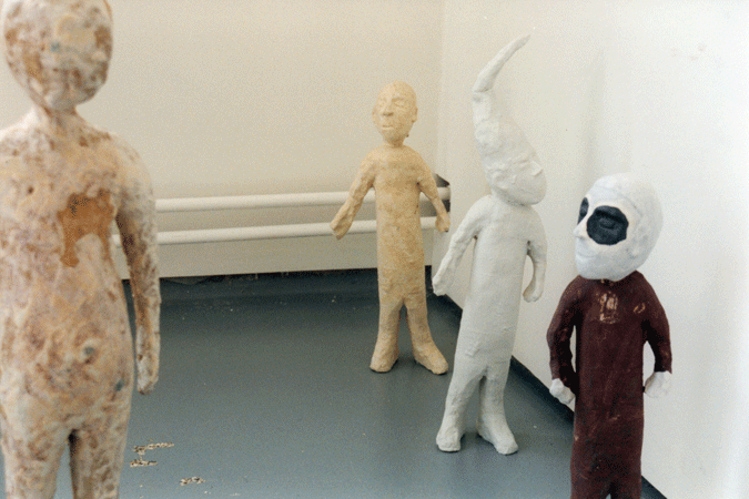 Skinmen is the name given to a number of series of figurative works which experimented with ideas concerning the human form as well as a wide range of ceramic processes, techniques, and materials. These works were exhibited in several solo and group exhibitions and in a variety of gallery and presentational settings. The figures were developed using hand-built as well as mold-forming processes, applying a natural element of variance when used in combination with each other. These formal properties serve as the pallette onto which an extensive range of surface additions are poured, brushed, dipped, sprayed, and drawn. These glazes, pigments, and engobes bring idiosyncratic characteristic to each figure, providing an identity to the sculptures which suggests an equally broad range of interpretations. The figures are at once innocent yet confrontational, archaic yet futuristic, accessible yet mysterious, provocative as well as comforting. They transmit, both as individual works and in series a diverse representation of recognisable attributes and human sensibilities.
