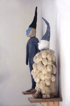 Skinmen is the name given to a number of series of figurative works which experimented with ideas concerning the human form as well as a wide range of ceramic processes, techniques, and materials. These works were exhibited in several solo and group exhibitions and in a variety of gallery and presentational settings. The figures were developed using hand-built as well as mold-forming processes, applying a natural element of variance when used in combination with each other. These formal properties serve as the pallette onto which an extensive range of surface additions are poured, brushed, dipped, sprayed, and drawn. These glazes, pigments, and engobes bring idiosyncratic characteristic to each figure, providing an identity to the sculptures which suggests an equally broad range of interpretations. The figures are at once innocent yet confrontational, archaic yet futuristic, accessible yet mysterious, provocative as well as comforting. They transmit, both as individual works and in series a diverse representation of recognisable attributes and human sensibilities.
